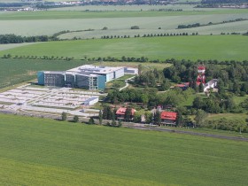 Pohled z letadla na nové sídlo Řízení letového provozu ČR v Jenči u Prahy