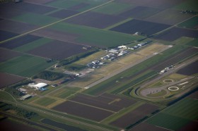 Pohled na malé letiště v Nizozemí. Na okraji letiště můžete vidět B747-200 KLM, který je zde rekonstruován do výstavní podoby