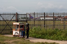 Ten chlap není ostraha letiště-je to jeden z místních, co jel náhodou kolem. Na nohou má žabky-při těch teplotách tam snad nejde ani nosit nic jinýho. Ostrahu sem sice viděl, ale nás za plotem si nevšímali.